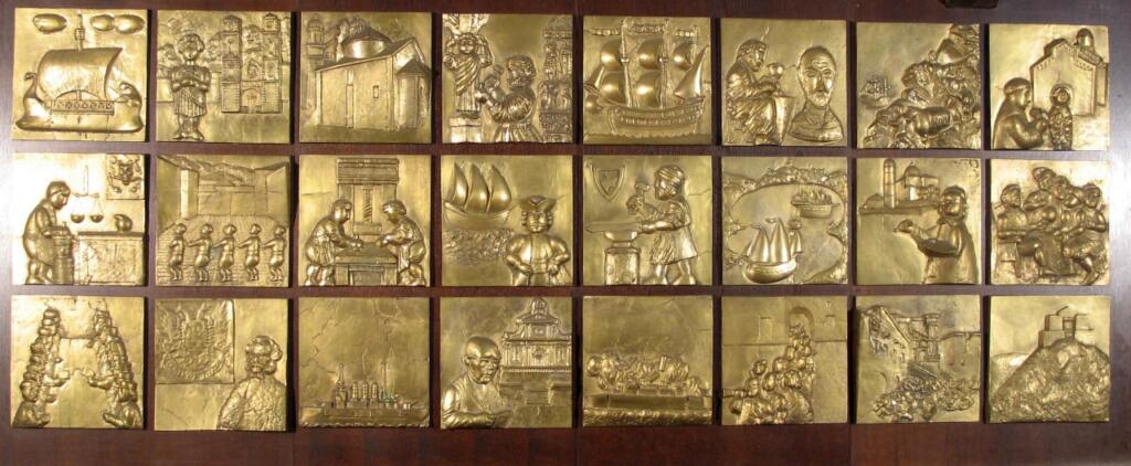 U ovom kraju koji je živio sa morem i od mora, sasvim je prirodno da je najviše zastupljena ta egzistencijalno važna pomorska tematika, i to na 9 reljefa (br. 1, 5, 10, 12, 14, 16, 18, 19 i 21). Inače u svakome od tri niza bronzi, posebno se ističu portreti po dva broda, a veliki broj ličnosti su najuže vezani za plovidbu.